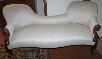 with carved arm supports, upholstered in cotton fabric, raised on scrolling feet. Width 175cm. -