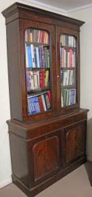 the over hanging cornice above two glazed doors, enclosing shelves, above panelled doors, on plinth base. Width 124cm. -