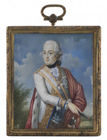 Lot Description:French 18th century miniature portrait of a nobleman, watercolour on paper in fine ormolu and brass frame