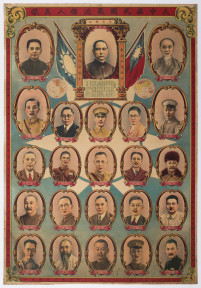 Notes:This poster depicts prominent figures from the early days of China’s Republic. Sun Yat-sen, the first President of the Republic of China, is in the upper centre surrounded by the Kuomintang flag (representing the Nationalist Party of China, of which he was a co-founder), and the flag of the Republic of China. To his right is Lin Sen (Chairman of the National Government of the Republic of China from 1931 to 1943). To his left sits Wang Jingwei, a politician and advocate of Chinese Nationalism who helped to overthrow the Qing Dynasty in 1911. The portraits also include Chiang Kai-shek (leader of the Republic of China, 1928 to 1975).