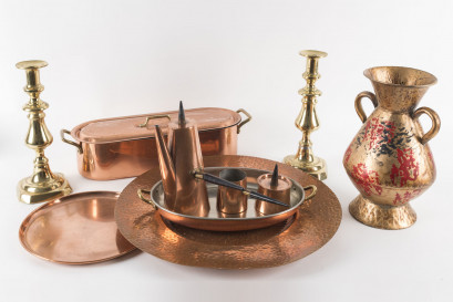 Lot Description:Pair of antique brass candlesticks, copper fish kettle, coffee set, tray, dish and metal pot, 19th and 20th century