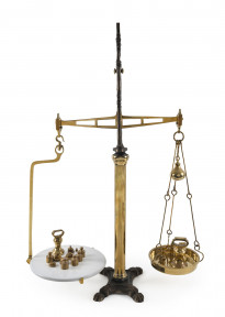 Lot Description:Set of brass and iron scales with porcelain pan and assorted weights including nice set of bell weights