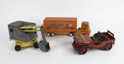 Lot Description:WILLYS tinplate jeep, MAR TOYS tinplate digger, plus a “Van Linseed” tinplate toy truck, mid 20th century