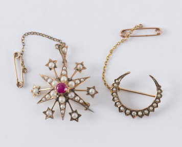 Lot Description:Two antique 9ct gold brooches with seed pearls and garnet, 19th century