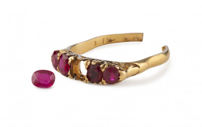 Lot Description:An antique yellow gold ring set with rubies, as is condition, shank has been cut and one ruby loose