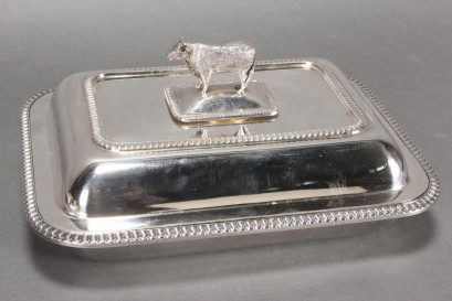 marked, of rectangular form, the cover set with cow finial, accented with gadrooned borders, l 27cm -