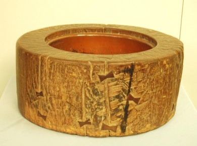 Cedar wood charcoal brazier with a copper liner and multiple butterfly hinges from a single tree trunk.