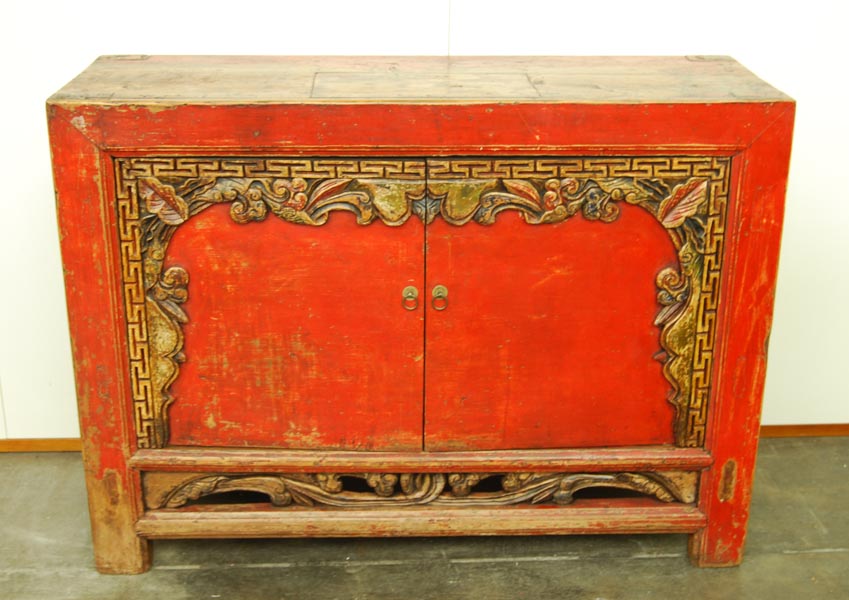 Provincial red painted rice storage chest from Gansu province with a deep carved floral frieze.