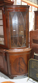 astragal glazed upper door with internal wooden shelving, base with flame mahogany paneled door with internal shelf, comes with keys, slight AF to polish, 182.5 cm T -