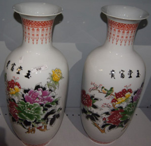 Lot Description:Pair of Chinese ornate vases with calligraphy and floral detail