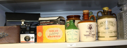 film camera, demijohns decanter, boxed cameras, plus a folding camera -