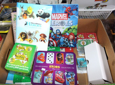 Marvel heroes disks, cards incl. Aussie Animals, Super Animals, Dreamworks Heroes, incl. various albums, large quantity cards incl. a full master box of cards unused etc. -