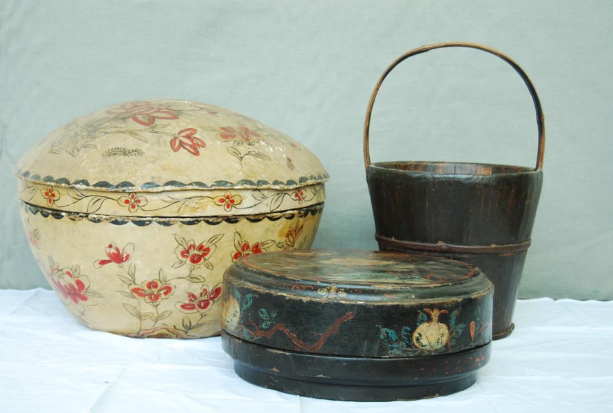 Lot Description:Chinese Cake Box, A Cedar Bucket And A Papier-Mache Container. C18th-C20th