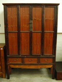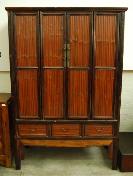 Four door three drawer pine cabinet with inset bamboo exterior.