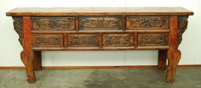 Seven drawer painted and deep carved Buddhist altar with floral design.