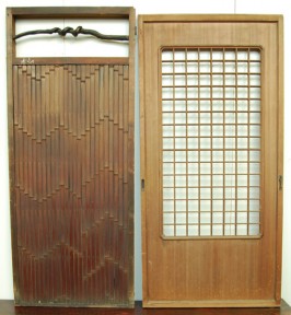 Two interesting Japanese doors, one latticed door made from Paulownia wood, one door made with a Cypress wood frame, root decoration and Bamboo inset panelling.