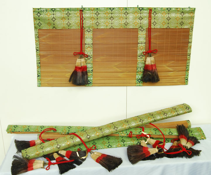 Five various split bamboo temple blinds bound in a green brocade with metal hooks. -