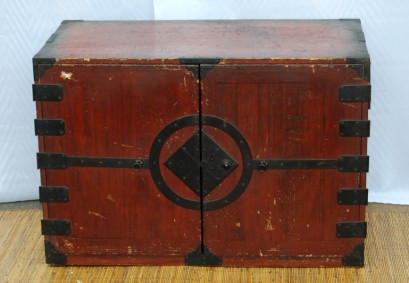 Red lacquered paulownia wood double door chest of drawers with a family crest in iron.