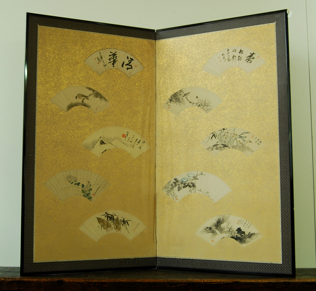Ten individual fan paintings attached to a two panel screen with a sprinkled gold leaf ground.