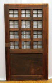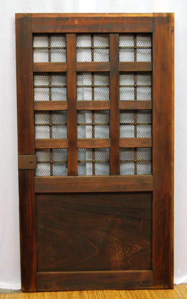 Zelkova and cypress wood security door from a stock house (Kura) with inset wire overlaid with iron bars.