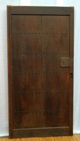 Fine quality cypress wood security door from a stock house (Kura) with iron studs and lock.