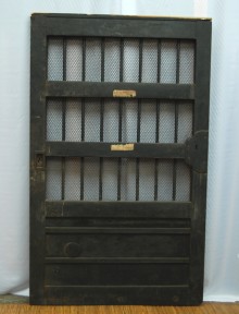 A substantial iron bound security door from a (Kura) stock house with vertical iron bars, copper wire and iron locking plates.