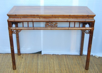 Chinese rosewood wine table with a carved apron of simulated bamboo and vine leaves with simulated bamboo legs.