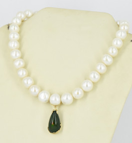 34 off-round pearls of approx. 11-12mm, with a pendant set with a black opal of 14.65ct and mounted in 9ct yellow gold inset with two diamonds of 0.02ct. Length 19cm. -