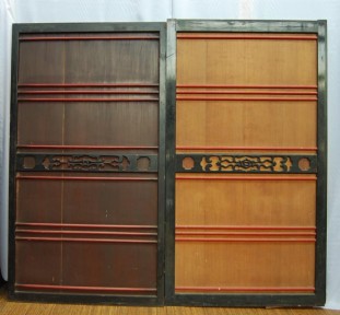 Set of four red and black lacquer cedar and cypress sliding doors from an old sake house.