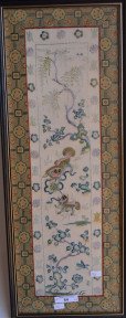 believed to be from a Mandarin robe sleeve, later framed with brocade border, sleeve panel measures 49 cm x 12.5 cm, comes with a certificate of authenticity with photograph 1985 -