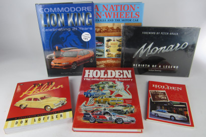 including 'HOLDEN - The official racing history' hardcover book by Stewart Wilson, signed by Peter Brock, published 1988 by The Chevron Publishing Group, 367 pages, 'Commodore Lion King - Celebrating 21 Years' hardcover book by Bill Tuckey, with multiple signatures including Peter Brock, Thomas Mazera, Cameron McConville, published 1999 by Quill Visual Communications Pty Ltd, 252 pages, 'Monaro - Rebirth Of A Legend' hardcover book by Joshua Dowling, sealed; together with 'tassie early holden drivers reunion 09' poster, measures approx 30 cm wide, 42 cm high; and others. -