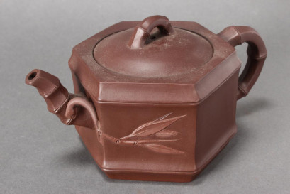of hexagonal form, with a bamboo form handle, spout and finial, mark to base, a/f, h 9cm -