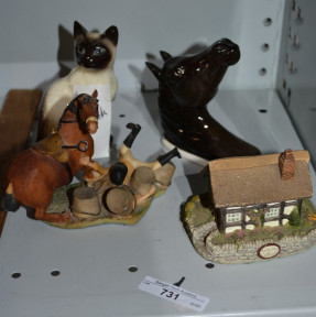horse head and a cat, Aynsley horse with rider figurine and a Memory Lane miniature cottage -