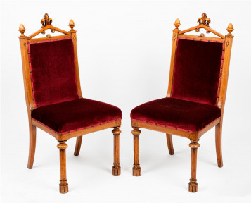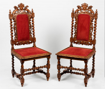 Lot Description:Two pairs of red velvet upholstered carved oak hall chairs, English 19th century