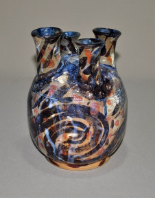 Four varying spouts, incised & combed lines, multi-coloured scrolls, splashed, with white drip glaze. Impressed seal "HB" to base. H18.5cm -
