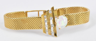 featuring an oval cabochon cut opal of approx. 2.55cts, surrounded by eight brilliant cut diamonds (two of 0.11ct, six of 0.20ct) on a 1mm wide mesh link strap. Total weight 40.3g. With Valuation -