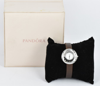sapphire crystal face, white dial, stainless steel case, quartz movement, genuine Pandora and leather band. Boxed. -