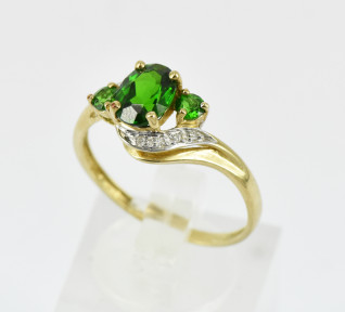 featuring green garnets and diamonds, on 9ct yellow gold. Size T. Weight 2g -