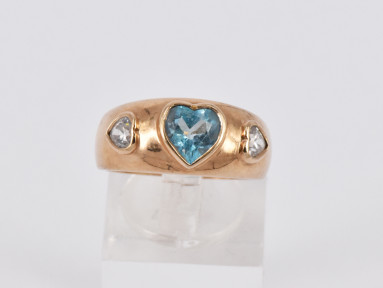 blue heart blue topaz with two CZ on side, set in 9ct yellow gold. Size Q-R. Weight 5.9g -