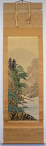 Lot Description:A Japanese Hanging Scroll with Fishermen Navigating the Rapids on a Bamboo Raft, Signed & a Red Seal