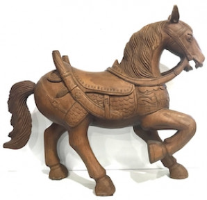 Lot #351 - A Large Carved Wood Horse with Ancient Saddle & Blanket, Sheath & Swords, Mouth Open & Right Leg Raised