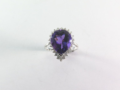 a drop-shape amethyst within a border of 24 brilliant-cut diamonds in 18ct white gold. Size N. -