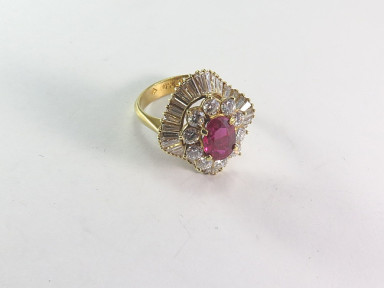 a bright oval ruby (7.8 x 5.6 x 3.14mm) claw-set in a border of ten brilliant-cut diamonds and a further undulating border of thirty-six baguette-cut diamonds; 18ct gold. Estimated weights| Ruby = 1.05ct, Diamonds 10 = 0.90ct, 36 = 1.50ct. Weight 5.7g. Size J. -