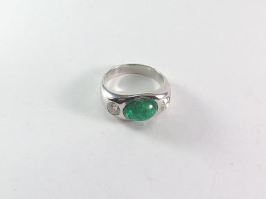 a cabochon Colombian emerald and two old European-cut diamonds hammer-set in platinum. Estimated weights| Emerald = 2.30ct, Diamonds 2 = 0.48ct. Size K. -