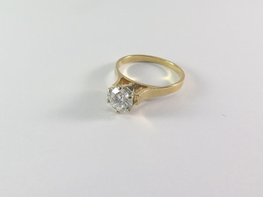 brilliant-cut diamond claw-set in white gold with an 18ct gold shank. Estimated weight of diamond 1.10ct graded in the setting as Colour I, Clarity VS2-SI. Size M+. -