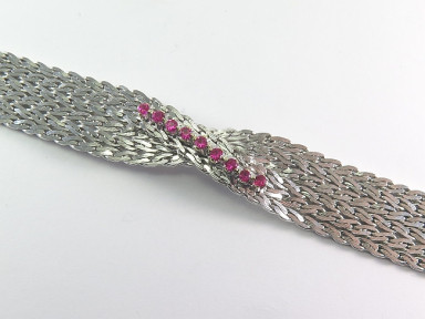 with overlapping centre section set with nine red stones; box clasp and safety catches. Weight 47.5g. -