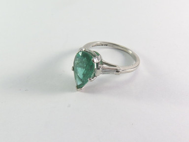 tear-drop emerald five-claw-set with two tapered baguette-cut diamonds; platinum. Estimated weights| Emerald = 2.40ct, Diamonds 2 = 0.25ct. Size L. -