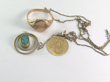 a 9ct gold signet ring, an opal doublet and gold pendant (in pieces), a 9ct gold pendant; and a metal chain. (4) Total gold weight 6.8g. -