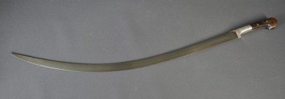 Blade of Persian Wootz. 'Black Korosan' type. Gold inlaid cartouche reads 'Assad Alah'. Small pommel hilt as used by Turkoman within the Imperial Russian Army.