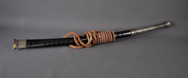 Highly decorated blade with silver overlay depicting the lives of Buddha. Niello silver hilt. Silver mounted black lacquer sheath with purple silk cord. As carried by senior civil court officials.